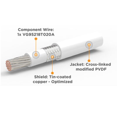 VG95218 T022 Type C kabel is een hoogwaardige enkeladerige kabel die is ontworpen voor gebruik in omgevingen waar elektromagnetische interferentie (EMI) en mechanische bescherming een prioriteit zijn. Deze kabel is volledig goedgekeurd volgens de VG 95218-specificaties en combineert uitstekende elektrische prestaties met optimale afscherming en bescherming tegen omgevingsinvloeden. Deze kabel bevat een enkel VG95218T020A-element met een dual-wall constructie, bestaande uit radiation crosslinked Polyalkene als primaire isolatie en radiation crosslinked polyvinylideenfluoride (PVDF) als primaire jasje. Rondom de geleider bevindt zich een geweven afscherming van vertind koper, die geoptimaliseerd is voor maximale afschermingsefficiëntie tegen gevoelige lijnen of sterke EMI-omgevingen. De buitenste jasje van PVDF biedt extra mechanische en omgevingsbescherming, wat de kabel uiterst duurzaam maakt in veeleisende omstandigheden.